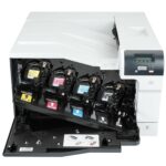 - Imprimante, cordon d’alimentation, guide de démarrage rapide, CD de logiciels et documentation, capacité réseau Fast Ethernet 10/100 Base-T intégrée, cartouches d’impression noir, cyan, magenta et jaune HP Color LaserJet préinstallées avec toner HP ColorSphere, bac universel 100 feuilles, bac d’alimentation 250 feuilles