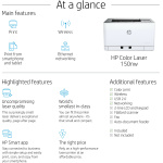 - Imprimante HP Color Laser 150nw; Cartouches échantillons P 117A préinstallées pour imprimante laser (700 pages en noir, 500 pages en cyan, jaune, magenta); Tambour d’imagerie; Unité de récupération du toner; Affiche d’installation; Guide de référence; Brochure d’assistance; Guide de garantie; Sans CD-ROM; Cordon d’alimentation; Câble USB